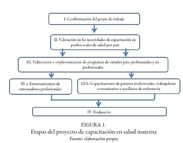 La elaboración del plan de capacitación para profesionales se realizó considerando su implementación a través de un formato semipresencial y se denominó formación de entrenador de entrenadores en salud materna. Para ello se consideró la incorporación del tema educación para adultos, además de las temáticas obtenidas de la valoración de necesidades. Esto, con el fin de permitir que la generación de competencias, así como el acceso a contenidos impartidos en el marco del proyecto, pudiera trascender su extensión y generara un efecto de escalamiento de los programas a través de una capacidad instalada de reproducción de estas. Los candidatos a entrenadores fueron seleccionados por la autoridad nacional de salud de cada país en colaboración con la oficina local de la OPS/OMS. Este programa, a su vez, se implementó en dos fases para facilitar el seguimiento y monitoreo de los países participantes.
