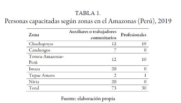 Por su parte, las posteriores capacitaciones de las obstetrices estuvieron dirigidas a personal que asiste a población, principalmente de etnias nativas como ahuajun y wampis, quienes valoraron lo actualizado de los temas, así como la pertinencia cultural con la cual fueron abordadas. En la tabla 1 se puede observar el número de personas capacitadas por las obstetrices, según las zonas.