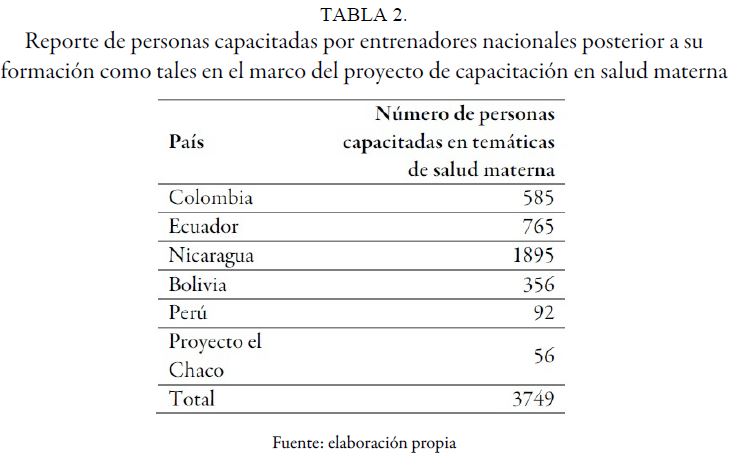 Otra forma de capacitar a personal no profesional fue la utilización de los contenidos trabajados por parte de los entrenadores nacionales, quienes en actividades propias de su rol local entregaron información a profesionales y auxiliares de enfermería en actividades de capacitación no necesariamente adscritas al proyecto, pero en las cuales utilizaron material emanado en el contexto de este ( tabla 2).