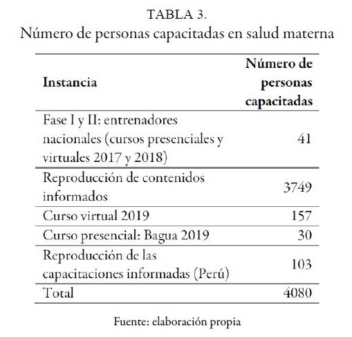 La atención otorgada por personal calificado y competente, con conocimiento actualizado, basada en la evidencia, centrada en las personas, segura y eficiente, es uno de los aspectos fundamentales para considerar en el marco de una atención de calidad ( 19). El propósito de este estudio fue compartir la experiencia en formación de recurso humano competente en Latinoamérica para el abordaje de la salud materna, teniendo cuenta todos los aspectos de calidad de atención, principalmente en APS. Como reflejo de ello, en el periodo de ejecución del proyecto, el cual fue básicamente de tres años, se capacitaron más de cuatro mil personas en las temáticas de salud materna en distintas instancias.