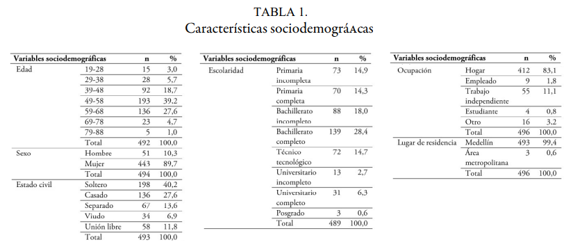 Estudio descriptivo-trasversal (19) en dos programas de capacitación de cuidadores familiares de la ciudad de Medellín, entre noviembre del 2017 y septiembre del 2019. En el estudio participaron 496 cuidadores. La muestra fue obtenida a conveniencia.