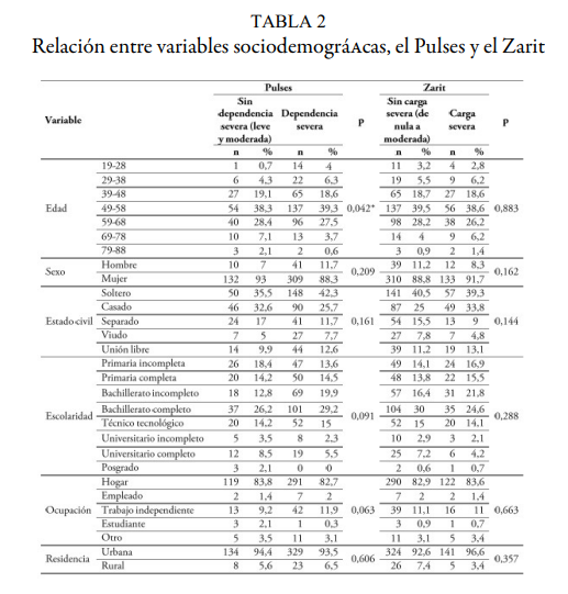 En la tabla 2 se relacionan las variables sociodemográficas con las escalas de Pulses y Zarit, recodificadas en carga y dependencia severa y sin carga severa (que corresponde a carga nula, leve moderada para el Zarit) y sin dependencia severa (que corresponde a dependencia leve y moderada para el pulses).