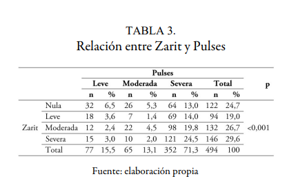 Respecto a las categorías de las puntuaciones, existe asociación estadísticamente significativa entre lo obtenido con el Zarit y el Pulses (p < 0,05). Llama la atención que el 24,5 % percibe una carga severa en ambas escalas; el 2 %, moderada en Pulses, pero severa en Zarit y un 3 % carga leve en Pulses pero severa en Zarit como se observa en la tabla 3.