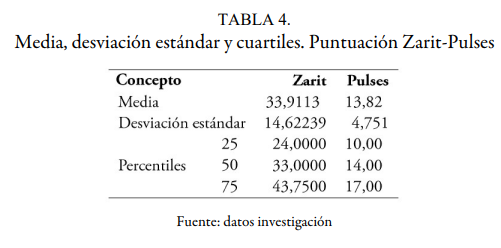 Se puede ultimar que la media del Zarit dentro de la muestra fue del 33,91, lo que enseña una carga moderada y una media del pulses de 13,82 describe un nivel de dependencia severo. De la muestra con relación al Zarit, el 25 % de la muestra obtuvo un puntaje inferior o igual a 24; el 50 % obtuvo 33 o menos y el 75 % obtuvo una puntuación igual o inferior de 43,7. Con relación al Pulses el 25 % obtuvo un puntaje inferior o igual a 10; el 50 % igual o inferior a 14; y el 75 % igual o inferior a 17. Como se observa en la tabla 4; por tanto, el 50 % de los participantes se encuentran entre carga moderada y severa. Igualmente, la persona que cuida está en un nivel de dependencia moderado o severo.