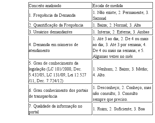 O Bloco II procurou analisar a demanda por informações das contas públicas registradas no DCF da UFES, além de identificar os demandantes e a frequência da demanda; analisou também o uso dos portais de transparência pelos gestores da UFES, criados por leis anteriores ou pela própria LAI, e o conhecimento desses respondentes em relação as legislações de transparência do governo federal. Os conceitos analisados e a escala utilizada para medida de cada conceito estão apresentadas no Quadro 1.