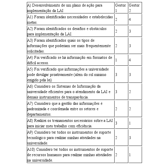 O gestor responsável pela implementação da LAI na UFES, afirma que houve um plano de ação e uma comissão formada por três servidores para desenvolver um sistema informatizado que serviria como porta de entrada e divulgação das informações na universidade. Segundo esse gestor, o sistema chegou a ser desenvolvido, mas não foi utilizado por que dias depois o governo federal disponibilizou o e‐SIC que deveria ser utilizado por todas as entidades públicas federais. Logo após o desenvolvimento e entrega do sistema o gestor responsável pela comissão deixou a função de responsável pela LAI na UFES que foi assumida pelo Ouvidor atual. As respostas dos dois gestores, ouvidor geral (gestor 1) e responsável pela implementação da LAI (gestor 2), estão apresentadas no Quadro 2.