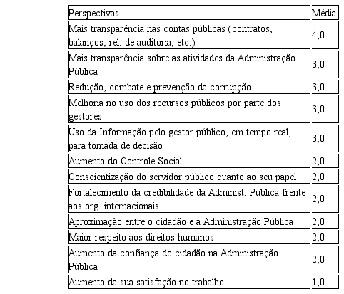 Os resultados mostram que das perspectivas dos gestores respondentes o item que parece ter mais chances de se realizar foi: mais transparência nas contas públicas (contratos, balanços, relatórios de auditoria, etc.); e o item que, segundo os respondentes, é mais difícil de ocorrer com a implementação da LAI e recebeu menor pontuação média foi o aumento da satisfação no trabalho, como apresentado Quadro 3.