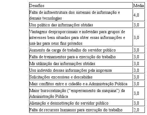 Em relação aos desafios com a implementação da LAI, os resultados mostram que conforme resposta dos gestores o item que parece ser o maior desafio é a falta de infraestrutura dos sistemas de informação e demais tecnologias. Nota‐se que os demais itens, salvo uma exceção referente a falta de recursos humanos, foram apontados com nota média 3,0, ou seja, considerados desafios com grande probabilidade de ocorrência na opinião dos respondentes e sinalizando a preocupação dos gestores com esses possíveis problemas. O resultado é apresentado no Quadro 4 que apresenta os resultados da média das respostas por item analisado, classificados da maior para a menor pontuação média, em relação aos desafios com a implementação da LAI.