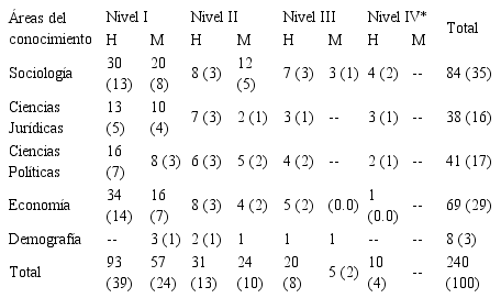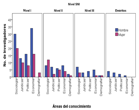 La Figura 1 muestra con mayor claridad estas diferencias. Apenas en el nivel II en el área de ciencias políticas se observa casi una cercanía entre hombres y mujeres.