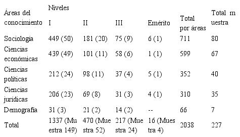 La población está compuesta de 2,038 investigadores del Sistema Nacional de Investigadores (SNI) del área V de las ciencias sociales, está formada por sociología, demografía, ciencias políticas, ciencias jurídicas y ciencias económicas. De esta población se extrajo una muestra aleatoria estratificada de 10% (227) investigadores nacionales que se presentan en la Tabla 1 según los niveles.