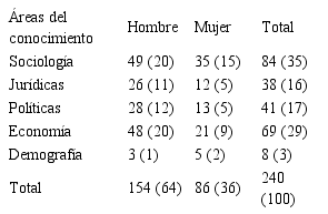 La muestra aleatoria estratificada seleccionada para esta investigación fue 10% (227) investigadores nacionales, pero se analizaron los datos de 240 (12%) de éstos, tomados de los currículos académicos. La Tabla 2 presenta el género de los investigadores del SNI según las áreas del conocimiento. Los hombres representan 64% de la población, mientras que las mujeres alcanzan 36% de participación. En otras palabras, en relación con los hombres las mujeres representan solamente 1/3 de investigadores nacionales homologados por el SNI. El predominio masculino es evidente y la proporción es siempre de 1 mujer por cada 3 hombres en todas las áreas del conocimiento.