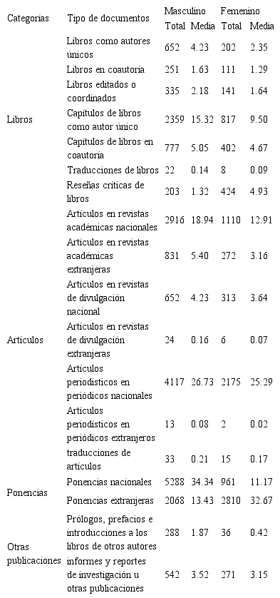 Esta Tabla contrasta los totales publicados por género, así como la media por cada tipo de documento. En el caso femenino sobresalen los siguientes tipos de documentos, ponencias publicadas en eventos extranjeros con una media de 32.67, artículos periodísticos publicados en periódicos nacionales con una media de 25.29, artículos en revistas académicas con una media de 12.91, y ponencias presentadas en eventos nacionales con una media de 11.17. En el caso del género masculino sobresalen los siguientes tipos de documentos, ponencias publicadas en eventos nacionales con una media de 34.34, artículos periodísticos publicados en periódicos nacionales con una media de 26.73, artículos en revistas académicas nacionales con una media de 18.94, y capítulos de libro como autor único con una media 15.32. En ambos casos las ponencias son los documentos con una mayor representación, aunque el género femenino prefiere la presentación y publicación de ponencias en eventos realizados en el extranjero. También en el mismo orden de preferencia están los artículos periodísticos en periódicos nacionales y los artículos publicados en revistas académicas. Ambos géneros tienen tendencias similares de publicación, pero en el caso del género masculino hay mayor representación dentro de la muestra estudiada que en el caso de las mujeres.
