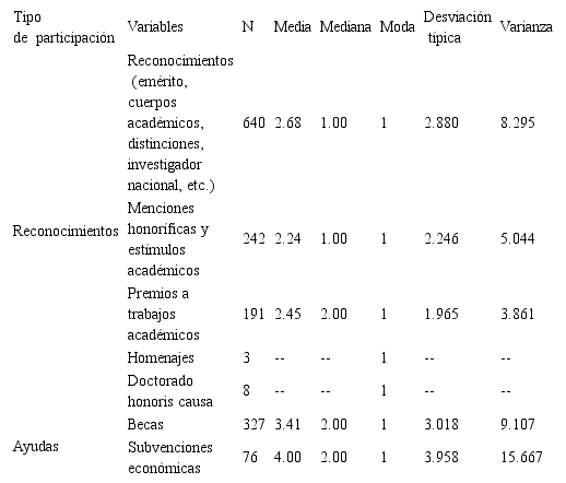 El SNI establece como propósito fundamental “reconocer la labor de las personas dedicadas a producir conocimiento científico y tecnología. El reconocimiento se otorga a través de la evaluación por pares y consiste en otorgar el nombramiento de investigador nacional […]” (CONSEJO NACIONAL DE CIENCIA Y TECNOLOGÍA, SISTEMA NACIONAL DE INVESTIGADORES, 2014). En otras palabras el SNI otorga un reconocimiento académico a los científicos que desarrollan investigación en el ámbito nacional. Por esta razón en este trabajo también se analizaron los reconocimientos académicos recibidos por los investigadores nacionales de la muestra estudiada. La Tabla 5 presenta las medidas de centralidad y dispersión del reconocimiento académico. Se entiende por reconocimiento premios, estímulos, pertenencia a cuerpos académicos, menciones honoríficas y doctorado honoris causa, entre otras distinciones recibidas por un investigador por su desempeño en la trayectoria académica. Para estimar los 6 valores de las variables listadas en esta Tabla se usó el volumen de reconocimientos académicos incluidos en los currículos laborales de la muestra estudiada de investigadores. Estas 6 variables están agrupadas en dos tipos de participación denominadas reconocimientos y ayudas. Cada una de estos tipos de participación a su vez está subdividas en variables.