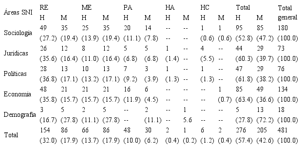 Esta desproporción en la representación de los hombres en relación con las mujeres también fue observada en México por Marmolejo Leyva (2015), quien muestra la desproporción de género que hay en todas las áreas del SNI. Solano Flores, et al. (2013) encontraron que en el año 2010 las mujeres solamente representaron 33% del total de investigadores del SNI. También Reyes y Suriñach (2012) encontraron que el número de hombres y mujeres en el SNI en el área de ciencias sociales en el periodo de 1996 a 2003 fue de 589 hombres contra 258 mujeres, es decir, 1 mujer por cada 2.2 hombres. Esta proporción se repite en todas las áreas, puesto que el número de hombres son 5,446, mientras que las mujeres alcanzan 2,193. Esta diferencia numérica entre hombres y mujeres también fue encontrada por Didou Aupetit y Gérard (2010) quienes hallaron que las mujeres son dos veces menos que los hombres en el SNI, es decir, hay 10,389 hombres contra 5,064 mujeres. De acuerdo con los datos presentados por estas autoras, en las ciencias sociales los hombres representan más del 60% y las mujeres apenas alcanzan 30% de representación en este sistema de investigación.