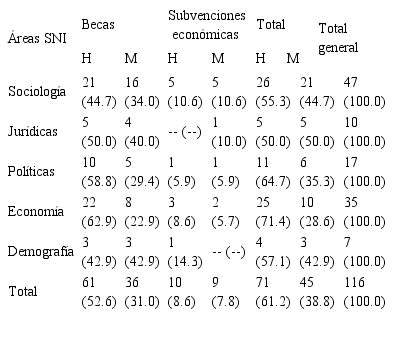 La Tabla 7 muestra 116 subvenciones económicas y becas otorgadas a los investigadores de la muestra estudiada. En general, los hombres (61%) obtuvieron más becas y subvenciones económicas que las mujeres (39%). La tendencia en todas las áreas del conocimiento que se estudiaron en esta investigación muestra que los hombres (53%) frente a las mujeres (31%) obtuvieron más becas, aunque en demografía hombres y mujeres obtuvieron el mismo porcentaje de becas y en ciencias jurídicas está diferencia es del 10%. En relación con las subvenciones económicas los hombres (9%) recibieron 1% más que las mujeres (8%).