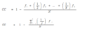 Para identificar la élite de los autores más productivos se usó la “ley de la raíz cuadrada” de Price (1963; 1965; 1969; 1971; 1975). Según esta ley, si k representa el número total de contribuyentes en una disciplina, representaría la élite del campo estudiado y esta élite generaría la mitad de las contribuciones publicadas. Para cada uno de estos autores se estimó también su respectivo “coeficiente de colaboración” (CC) (AJIFERUKE; BURELL; TAGUE, 1988). Este CC está basado en la idea de la atribución fraccional de la producción de documentos y puede ser expresada como: