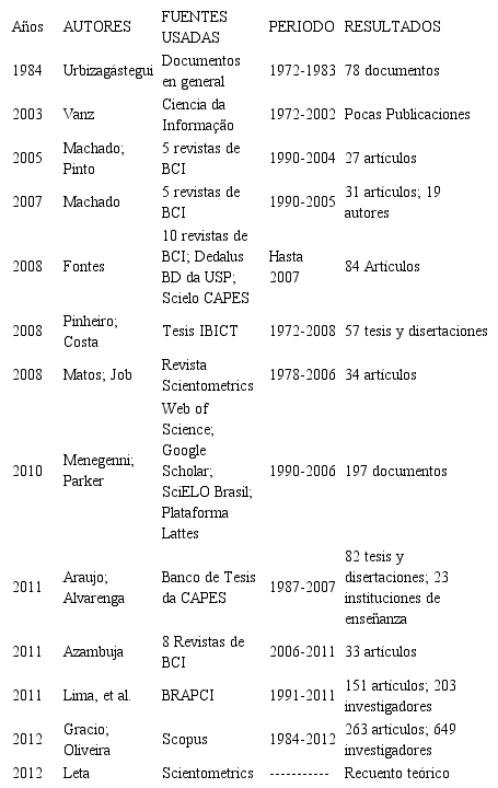 Hasta donde es del conocimiento de los autores de este artículo ningún investigador ha analizado la literatura brasileña sobre bibliometría en un periodo tan extenso y cubriendo todos los campos donde se exploran las aplicaciones bibliométricas en el país. El análisis de esta literatura ha sido realizado en periodos más cortos y centrados en campos especializados. Por ejemplo, Urbizagástegui (1984) analizó la producción científica brasileña en bibliometría entre 1972 y 1983 en el campo de la ciencia de la información encontrando 78 documentos publicados. Sus resultados mostraron que la ley de Bradford fue el tema principal de la producción intelectual hasta los años 1980, lo que podría explicarse por las aplicaciones prácticas inmediatas para la elaboración de listas básicas de revistas dedicadas a la formación de colecciones en las bibliotecas y centros de documentación existentes en el país. Casi 20 años después Vanz (2003) analizó los artículos sobre bibliometría publicadas en la revista Ciência da Informação en el período de 1972 a 2002. La autora señaló que existen pocas publicaciones sobre bibliometría en el país, aunque encontró que existe un interés creciente sobre este asunto desde finales de los años 1990. Aparentemente también “hay un estudio [de] Mugnaini y colegas (2004), que analizaron los indicadores de publicación que muestra el aumento significativo de la producción científica brasileña en bibliometría en los últimos 20 años, así como su internacionalización. También llegaron a la conclusión que existe una concentración de estos investigadores en la región sureste y que hay una ampliación de la alianza de investigadores brasileños con investigadores de otros países principalmente Estados Unidos y Europa” (Citado por MATOS; JOB, 2008, p. 50).