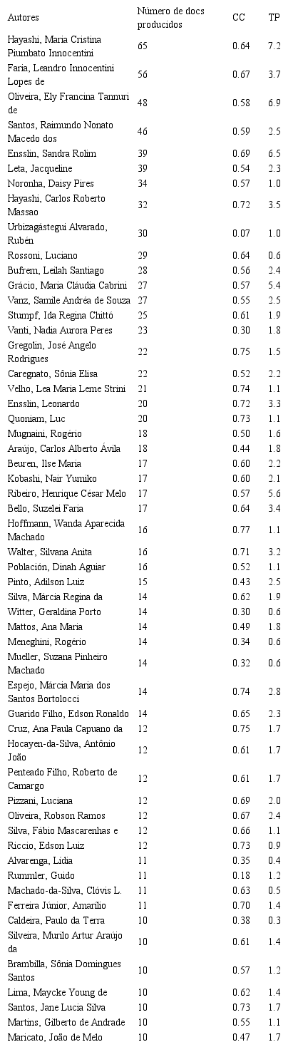 También se estimó la tasa de producción (TP) de cada autor del grupo que conforma la elite de productores en bibliometría en el Brasil. Esta tasa de producción no es más que la división del número de total de documentos producidos entre el número de años transcurridos desde el año de publicación del primer documento hasta el año de publicación del último documento de cada autor analizado.