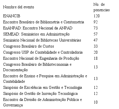 Se identificaron también 183 eventos diferentes en los que fueron presentadas 840 ponencias. Trece de esos eventos son centrales para la diseminación de los resultados de las investigaciones. Muchos de estos eventos son de diferentes campos del conocimiento con predominancia de la bibliotecología y ciencia de la información, administración, contabilidad, costos, gestión y organización del conocimiento. Se identificó una élite de 55 productores pero estos no son responsables de la mitad de las contribuciones. Estos autores colaboran entre si y tienen una alta tasa de colaboración y productividad.