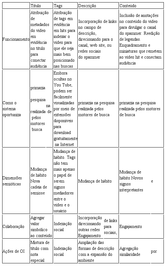 A possibilidade dos usuários atribuírem metadados na descrição de seus vídeos no You Tube favoreceu o surgimento da prática spammer. O caráter linguageiro e polifônico desta prática pode ser evidenciado no momento em que ao descrever seu vídeo, o usuário adiciona tags que estão em evidência e que não tem relação alguma com o conteúdo do vídeo postado. Neste sentido, ao mesmo tempo que reforça a ideia do vídeo principal que recebeu aquelas tags, os spammers conseguem, através desta prática, transmitirem alguma mensagem que almejam disseminar, seja ela uma propaganda, uma opinião ou qualquer outro conteúdo.
