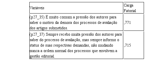 De acordo com o Quadro 08 é possível verificar o agrupamento de variáveis que se relacionam ao processo de “Gestão Editorial”. Neste, se destaca a lógica de que a gestão editorial deve ser alternada no campo de quem executa os processos da editoração. Tal postura denota maturidade no universo da academia e dos que estão editando os periódicos de Administração, Ciências Contábeis e Turismo. Neste caminhar o fator ora descrito ainda se mostra como a adoção da atividade minuciosa de proceder a recusa de trabalhos imediatamente quando de identificação ou quando do não respeito à normalização. Deve-se considerar, porém, que os autores submetem papers continuamente e o ato da recusa traz para os proponentes a necessidade de cuidados básicos na apresentação de seus manuscritos. De pronto, mesmo que o sistema de SEER permita as alterações no arquivo identificado e posterior designação para os pares apreciarem os trabalhos, a prática da recusa deve estar ancorada no alto fluxo de submissão de trabalhos aos periódicos. O sexto fator, denominado “Pressão dos Autores”, agrupou duas variáveis, conforme é possível observar no Quadro 9.