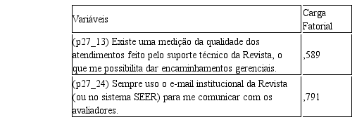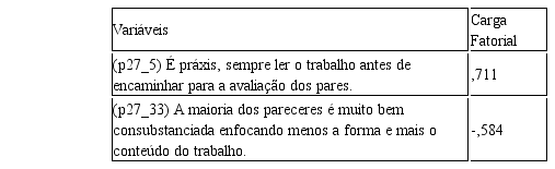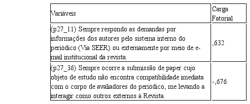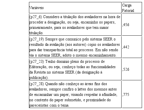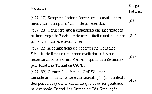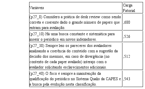 No fator Avaliadores e Editoração constatou-se o agrupamento de variáveis voltadas para o respeito à titulação e ao lattes dos avaliadores deixando-os cientes dos processos que envolvem a editoração do periódico, tendo o editor pleno domínio das fases editoriais.