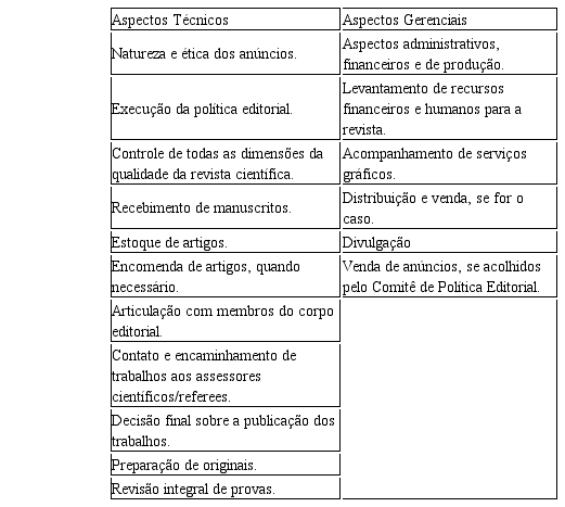 Trzesniak (2009) ao separar a atividade editorial nos aspectos técnicos e gerencial evidencia o conjunto de funções do Editor, quais sejam, tratar do fluxo editorial com revisões de textos, articular com os membros que compõem a Editoria e decidir tecnicamente as publicações finais que vão à comunidade, bem como ter como pano de fundo permanente o controle da qualidade de todas as dimensão do periódico são variáveis que devem ser objeto de atenção. De forma complementar, as funções gerenciais que envolvem os elementos administrativo, mercadológicos e financeiros, bem como a ampliação, manutenção e o respeito à linha editorial e banco de avaliadores.