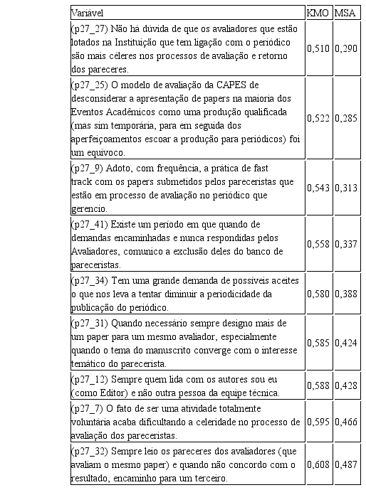 O processo teve início com as 41 variáveis que compunham o segundo bloco de questões do instrumento de coleta de dados. No entanto, em decorrência de problemas com o indicador Measure Sampling Adequacy (MSA) de algumas variáveis, diversos modelos precisaram ser rotacionados até o alcance de uma solução adequada sob o ponto de vista do rigor estatístico aplicado na literatura (MALHOTRA, 2006; HAIR et al, 2005). O Quadro 3, a seguir, apresenta em ordem de exclusão, as variáveis que precisaram ser desconsideradas do modelo e seu efeito sobre a medida Kayser-Meyer-Olkin (KMO):