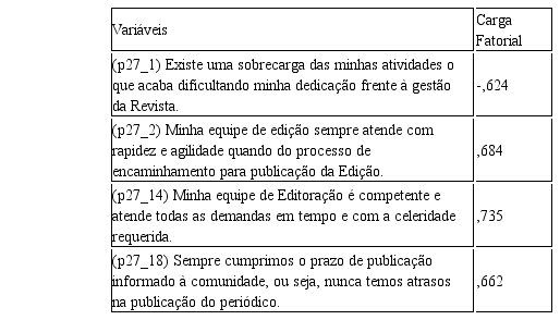 Detalhada a construção do modelo exploratório, é possível discutir os principais elementos norteadores no processo de gestão dos periódicos. Assim, o primeiro fator foi responsável por agrupar quatro variáveis do instrumento de coleta de dados, conforme é possível observar no Quadro 4, a seguir.