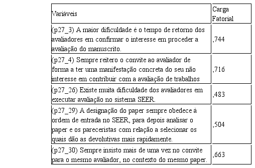 De acordo com o agrupamento apresentado no Quadro 05 é possível analisar que o segundo fator se direcionou a elementos voltados à dificuldade no processo de acatamento dos avaliadores, respeito às designações por ordem de entrada no SEER e pró-atividade do parecerista. Tendo em vista o conjunto de variáveis agrupadas optou-se por chamar este fator de “Avaliadores/Pareceristas”. O agrupamento realizado evidencia a necessidade do editor ser pró-ativo na busca por avaliadores ao mesmo tempo em que respeita os períodos de entrada e o encaminhamento aos pareceristas designados através do SEER. Tal conduta se mostra pertinente e correta, principalmente pelo fato da maioria dos processos serem cegos, no contexto da avaliação. No entanto, tal procedimento não garante os prazos de retorno descritos pelos periódicos. Avaliar um paper para um periódico é uma atividade voluntária e necessária, dentro do desenvolvimento do conhecimento e, por conseguinte, da ciência.