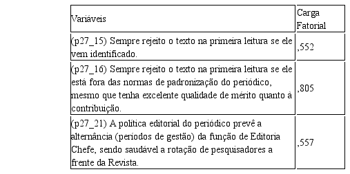 A alternância na gestão editorial e a recusa imediata de trabalhos (identificação e normalização) também foi um elemento identificado na formação dos fatores. Estes elementos estão reunidos no quinto fator, conforme expõe o Quadro 8.