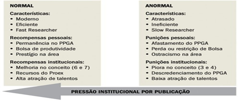 A figura 1 proposta por Rosa (2008) ao mesmo tempo em que ilustra a pressão institucional como indutor de normalidade, representada pelo volume crescente de produção científica em espaços temporais cada vez mais reduzidos, ela também possibilita a visualização de algumas sanções normatizadoras aplicadas aos programas e aos pesquisadores que não atingirem as diretrizes normativas de avaliação da pós-graduação stricto sensu.