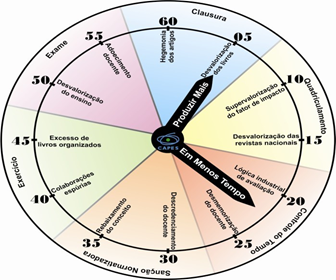 Ao trilhar o caminho dos seus mestres, as novas gerações estão aprendendo que a pesquisa é a única atividade da academia que traz status, dinheiro e realização pessoal, impactando, de certa forma, as demais esferas da função social da universidade (GODOI; XAVIER, 2010). O exame não está mais focado, como já dito, em avaliar a formação de pessoal especializado para atender as demandas dos empreendimentos públicos e privados, papel esse reservado, originalmente, a Capes, mas sim para examinar a formação de pesquisadores e produtores de artigos de periódicos científicos. Na figura 2 se encontra o relógio da Capes que simboliza o marcador/controlador do tempo da produtividade acadêmica dentro dos programas de pós-graduação stricto sensu, sintetizando, de modo geral, como cada uma das técnicas de disciplinarização dos corpos estão relacionadas ao surgimento de distorções no processo de construção e difusão de conhecimentos científicos.
