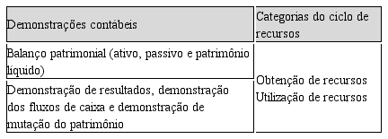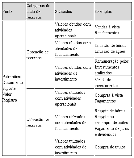 Ciclos de recursos: categoria que classifica as informações em entradas e saídas econômicas e/ou financeiras; e