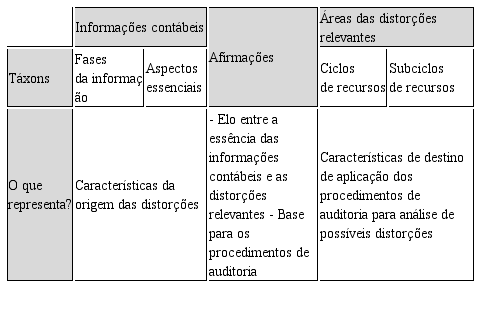 A estrutura do quadro apresentado, representa um extrato da taxonomia proposta, onde as características das informações contábeis estão vinculadas aos objetivos da auditoria, subdivididas em áreas de ocorrência de distorções.