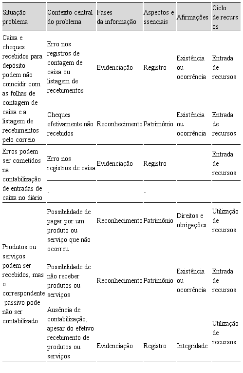 Na tabela 2 é apresentada uma situação problema com seu contexto, fases da informação, aspectos essenciais, afirmações e ciclo de recursos de acordo com a terminologia usada na contabilidade, a fim de ilustrar a inclusão das distorções contábeis na taxonomia proposta.