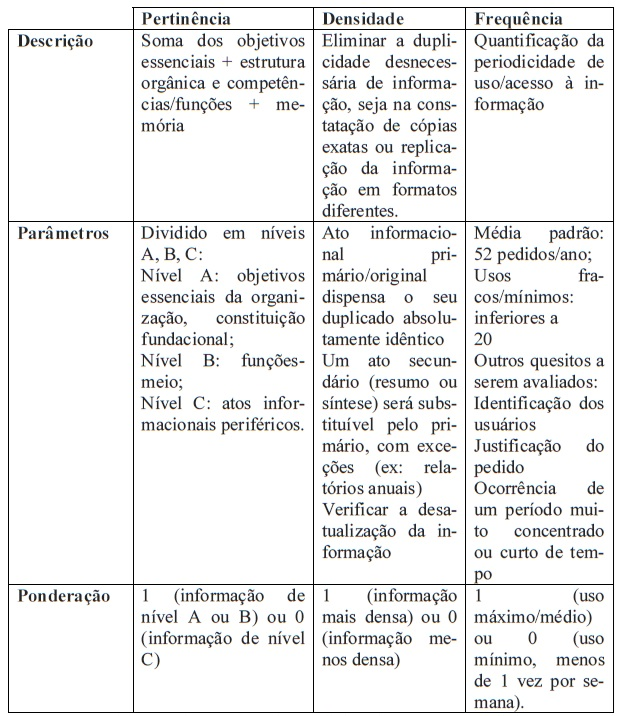 Como critérios e parâmetros, são estabelecidos a pertinência, no sentido de pertencimento a ação de alguém ou a alguma entidade; a densidade, relacionado ao conteúdo informacional primário ou secundário (original ou resumo/síntese, com ou sem cópia); e ainda a frequência, medindo o acesso a informação por parte dos usuários.