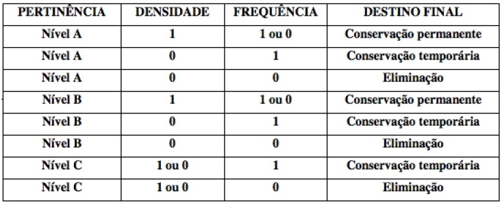 Da análise e cruzamento destes parâmetros, resulta-se em uma tabela que determinará a destinação da informação, conforme demonstrado: