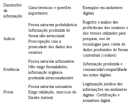 A natureza de cada um destes conceitos - indício, evidência e prova – são distintas, porém complementares, e são expressas no quadro abaixo, que exemplifica também as aplicabilidades em ambientes digitais: