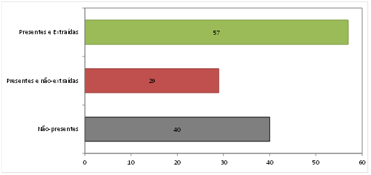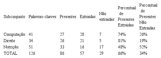 As palavras-chaves presentes e não extraídas na grande maioria apresentavam substantivos ou adjetivos etiquetados com classe gramatical errada pelo software, e por isso não foram extraídas. As palavras-chaves presentes e extraídas eram na maioria substantivos isolados (30%), substantivos seguidos de adjetivo (28%) e substantivo seguido de preposição e substantivo (19%).