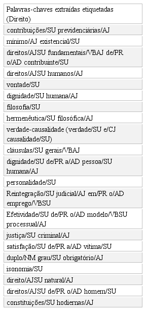 No subconjunto de Direito, das 34 palavras-chave indicadas pelos autores das teses e dissertações, 26 palavras-chave de fato estavam presentes nos documentos. Foi identificada uma lacuna de apenas 8 palavras-chaves não presentes, um fator positivo para o processo de indexação automática pois, o OGMA poderá extrair sintagmas nominais contendo mais palavras-chaves.