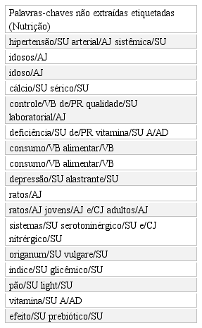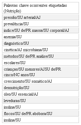 No subconjunto de Nutrição, das 51 palavras-chave atribuídas pelos autores das teses e dissertações, 33 palavras-chave ocorriam no titulo ou resumo dos documentos, em quatro casos todas as palavras-chave estavam contidas nos documentos, mas 19 palavras-chave não estavam presentes nos documentos.
