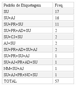 O quadro 9 exibe as frequências totais para cada padrão de etiquetagem das palavras-chaves presentes e extraídas como sintagmas nominais pelo OGMA.