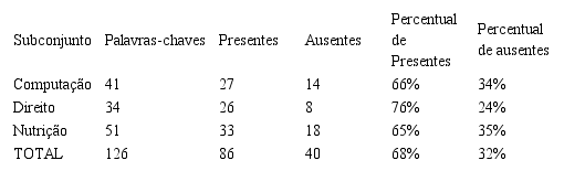 A Tabela 1 exibe os números totais para as palavras-chave nos três subconjuntos: Ciência da Computação, Direito e Nutrição.