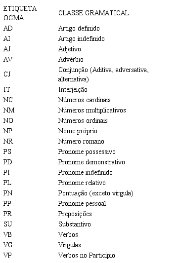 Para a descrição das estruturas gramaticais das palavras-chaves extraídas ou não extraídas como sintagmas nominais, são utilizadas as siglas das classes gramaticais atribuídas pelo OGMA na etiquetagem das palavras. Por exemplo, AD para adjetivo, SU para substantivo e assim por diante, como exibido no Quadro 1.