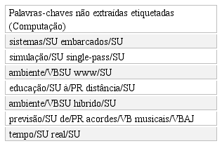 No Quadro 5 apresenta-se o padrão de etiquetagem e a frequência de ocorrência para palavras-chaves presentes e não extraídas em todo o corpus.