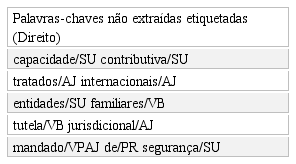 No subconjunto de Direito houve um número de palavras etiquetadas incorretamente, cinco no total, correspondendo aos cinco casos de palavras-chaves presentes não extraídas. Por exemplo, no documento d2 a palavra-chave “tratados internacionais” foi etiquetada como se houvessem dois adjetivos seguidos AJ+AJ, porém a palavra “tratados” nesse caso se trata de um substantivo, sendo o padrão de etiquetagem correto SU+AJ, se constituindo em um sintagma nominal. Erros na etiquetagem de adjetivos e substantivos são as causas principais da não revocação das palavras-chaves deste grupo.