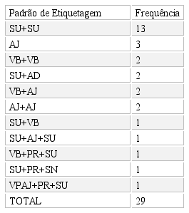 Os quadros a seguir mostram as palavras-chaves presentes extraídas e seu respectivo padrão de etiquetagem. Tais palavras-chaves foram consideradas sintagmas nominais por seguirem as regras de formação dos sintagmas nominais implementadas pela ferramenta OGMA.