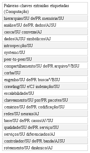 De acordo com o Quadro 6, no subconjunto de Ciência da Computação, cinco palavras-chave formadas unicamente por um substantivo “SU” foram extraídas pelo OGMA. Nota-se que dois termos estão em inglês e foram considerados pela ferramenta corretamente como substantivos. Outras cinco palavras são substantivos seguidos de adjetivo, tendo o padrão SU+AJ de etiquetas, como em “casca/SU convexa/AJ” e, nove palavras-chave seguem o padrão SU+PR+SU (substantivos ligados por preposição). Ambos os padrões de etiquetagem para termos compostos indicam no geral sintagmas nominais considerados bons descritores.