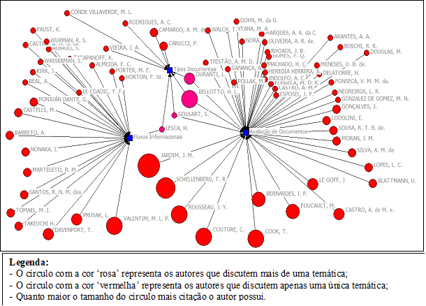 Os autores mais citados nos ‘fluxos informacionais’ foram Valentim com 6 trabalhos e Davenport e Prusak com 4 citações. Na temática relacionada aos ‘tipos documentais’ destaca-se Bellotto com 7 citações e Duranti com 4 citações. No que tange à última temática ‘avaliação de documentos’ destaca-se Jardim com 10 citações, Schellenberg em 7 e Cook, Couture e Rousseau com 6 citações. Assim, a partir deste estudo evidenciou-se que são os autores mais representativos da área.